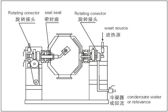 ◎ 在動(dòng)力驅(qū)動(dòng)下,罐體作緩慢旋轉(zhuǎn),罐內(nèi)物料不斷地混合,從而達(dá)到強(qiáng)化干燥的目的。