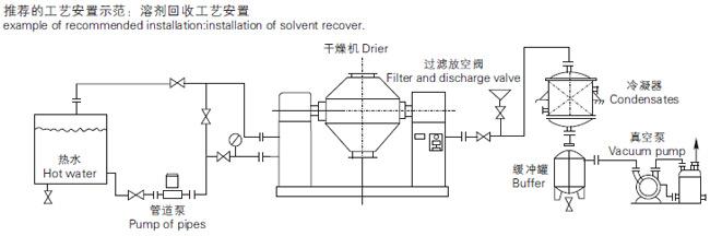 ◎ The raw material exists is under vacuum. The drop of steam pressure makes the moisture (solvent) at the surface of raw material become saturation and will evaporate. The solvent will be discharged through vacuum pump an recovered in time. The inner moisture (solvent) of raw material will infiltrate, evaporate and discharge continuously. The three processes are carried out unceasingly and the purpose of drying can be realized within a short time.