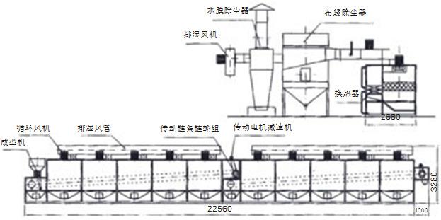 本機是我公司根據(jù)染料等物料壓率后高水分狀固有的特性,設(shè)計出的新型改進型網(wǎng)帶式干燥機,一般熱源等放置于右側(cè),工作時,物料先進入成形預(yù)熱機構(gòu),擠條造粒,同時也被脫去一部分水分,之后均勻分布在網(wǎng)帶上,干燥時,物料從網(wǎng)帶的上方和下方強制輸入熱風(fēng),使被干燥的每個粒子表面都成為受熱面,增大物料與熱風(fēng)的接觸面積顯著增加導(dǎo)熱面積,使物料內(nèi)部水份擴散。組合成的配合使其效率更高,節(jié)能性更好 。